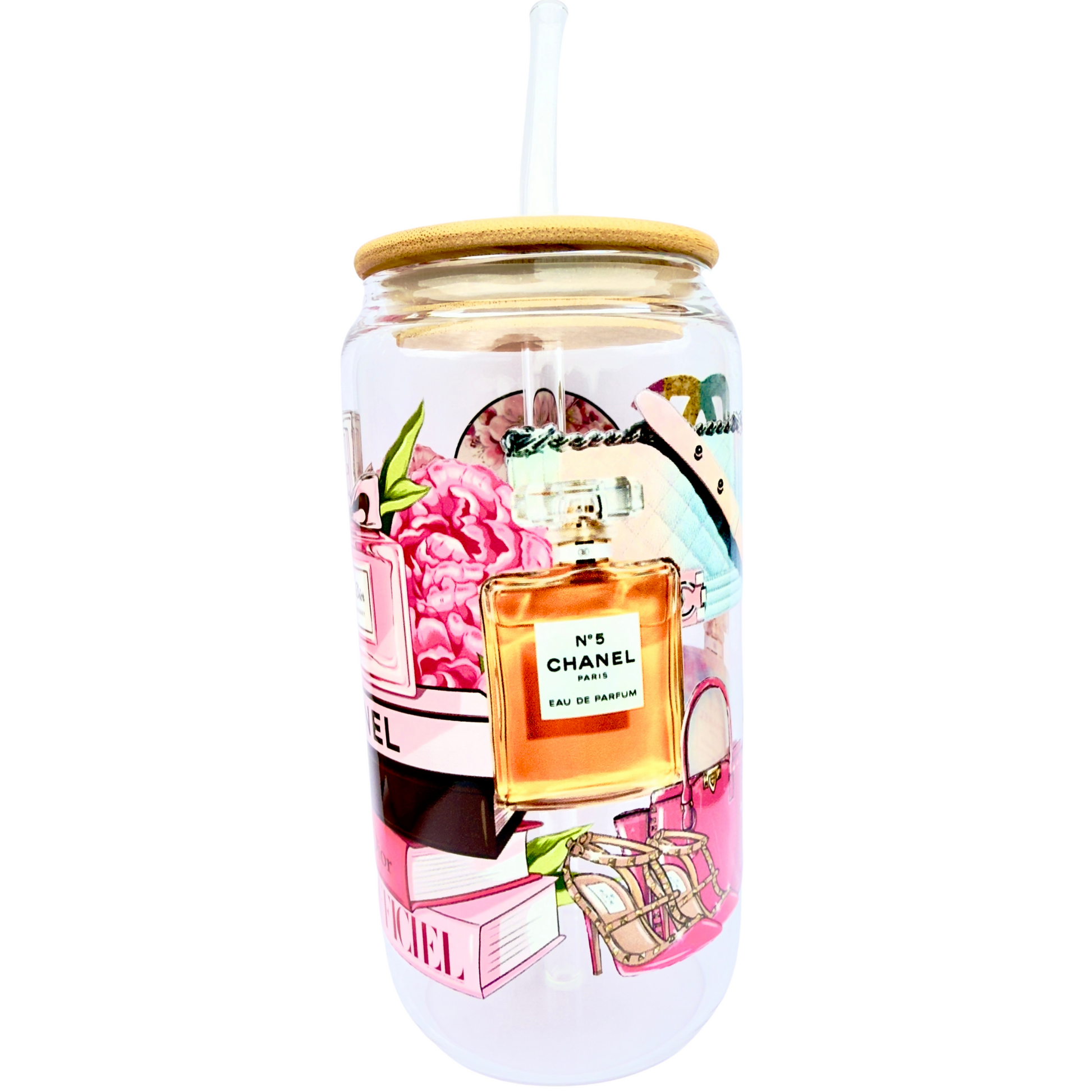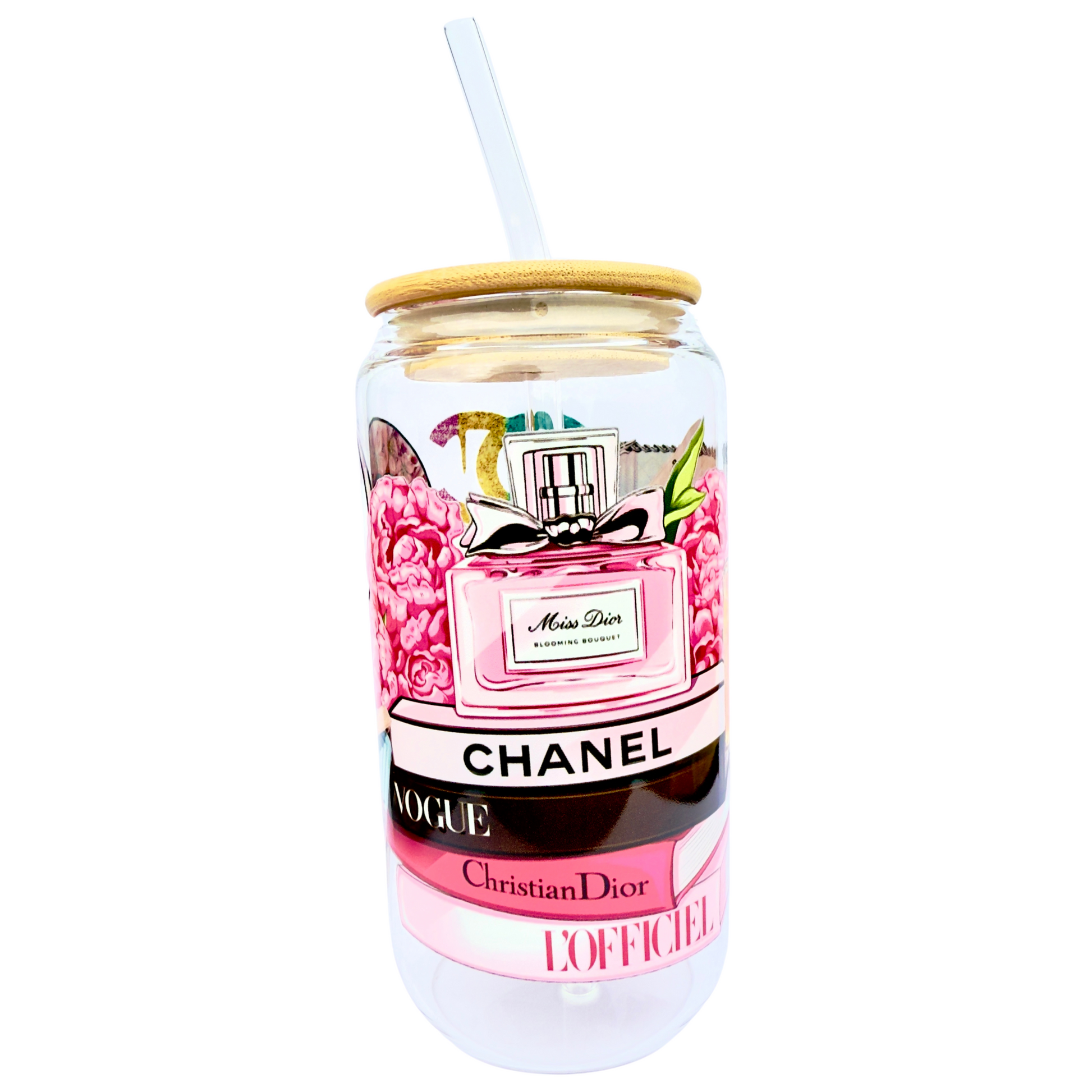 16oz Glass Tumbler with Bamboo Lid & Straw – Luxury Fashion & Perfume Design