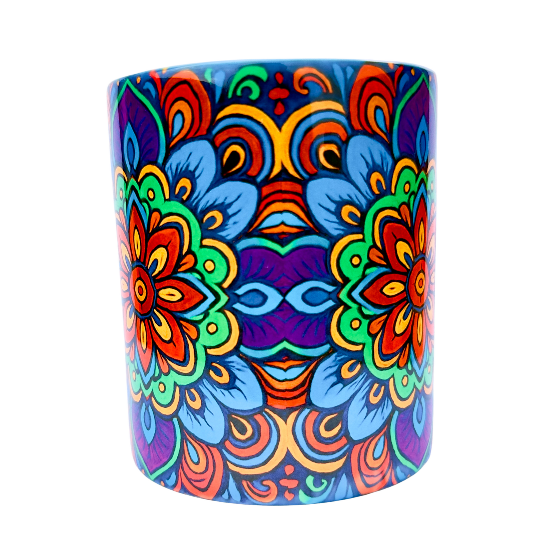 Add a burst of color and positivity to your daily routine with our Radiant Mandala 11oz Ceramic Mug. Featuring a striking hand-drawn mandala design in vivid blues, greens, oranges, and purples, this mug is more than just drinkware—it’s a celebration of energy, mindfulness, and creativity.